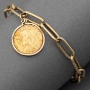 14kt gouden closed-forever armband waaraan een gouden 14kt gouden munthanger met gouden Zwitserse 20-Franc, 1949, gewicht 18,8 gram, 21 cm