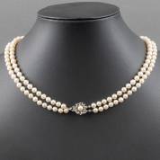 Tweestrengs parelcollier van en-chûte geknoopte gecultiveerde parels aan 14kt witgouden bolslot gezet met parel, brutogewicht 61,4 gram, circa 50 cm