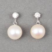 Paar 18kt witgouden oorstekers gezet met briljantgeslepen diamant, totaal 0.40ct en hangende gecultiveerde parel, brutogewicht 4,8 gram, parel 11 mm