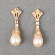 Paar 14kt gouden oorhangers gezet met druppelvormige parel en enkelgeslepen diamanten, totaal circa 0.36ct, brutogewicht 4,6 gram, 2,8 cm