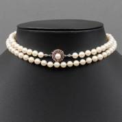 Parelcollier van gecultiveerde parels aan BWGG sluiting gezet met een entourage van parel en robijntjes, 71 cm
