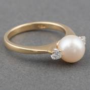 18kt gouden ring gezet met parel geflankeerd door twee briljantgeslepen diamanten, totaal circa 0.10ct, mt. 17,75, brutogewicht 5,0 gram