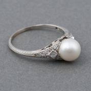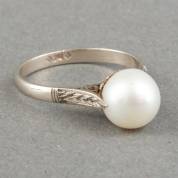 BWGG ring gezet met parel, circa Ø 8 mm, de scheen met bladmotief gedecoreerd, mt. 17,45, brutogewicht 2,6 gram