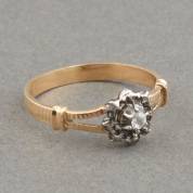 14kt gouden bloemring, het hart gezet met roosgeslepen diamant, circa Ø 6mm, omgeven door vijf kleinere roosdiamantjes, mt. 18,5, brutogewicht 5,4 gram