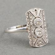 14kt witgouden ring gezet met twee diamanten in oudslijpsel, omgeven door acht roosgeslepen diamantjes gezet in platina , mt. 17,75, brutogewicht 2,6 gram