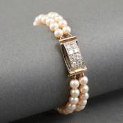 Tweestrengs parelarmband van en-chûte geknoopte gecultiveerde parels, aan 14kt wit- en geelgouden bakslot, pavégezet in platina met acht briljantgeslepen diamanten, totaal circa 0.80ct, brutogewicht 23,0 gram, circa 18 cm