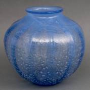 A.D. copier (1901-1991), blauwglazen balustervormige vaas met verticale ribben en ingesloten tincraquelé, Unica, gesigneerd en genummerd E 9, Glasfabriek Leerdam, 1928/29, 27 x Ø 30 cm