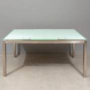 Tafel met rvs onderstel en twee uittrekbladen onder het witglazen blad, 75 × 160 × 100 cm