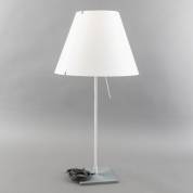 Tafellamp met geborstelde aluminium voet en witte polycarbonaat kap, model Costanza Tavolo zonder dimmer, ontwerp Paolo Rizzatto, uitvoering Luceplan, 80 × Ø 40 cm