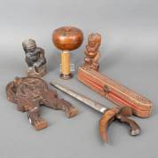 Acht diverse Aziatische voorwerpen, waaronder: lakwerk waaierdoos, kris, en paneel met Ganesha -gebruikssporen-