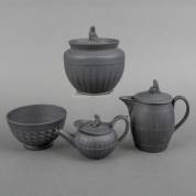 Vierdelig basalt ware theeserviesje, uitvoering Wedgwood en E.J. Birch, beide Engeland, eind 18e eeuw, bestaande uit: theepotje, roomstel, en kom -kleine beschadigingen-, afmetingen roomkannetje 13,5 × 13,5 × 8 cm