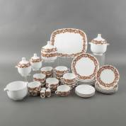 Porseleinen serviesgedeelte met bruin-wit decor van geabstraheerde bloemen, model Plus Cordial Braun, ontwerp Wolf Karnagel, uitvoering Rosenthal, Duitsland, jaren '60/'70, bestaande uit: zes borden Ø 26 cm, zes kleine borden, acht kommen met oren, negen kommen zonder oren, vier onderschotels, dienblad, vijf diverse (deksel)terrines, twee zoutvaatjes en een peperstrooiertje