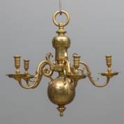 Vijflichts messing bolkroon, 19e eeuw -één kaarsenhouder en vetvanger los maar aanwezig-, 58 × Ø 62 cm