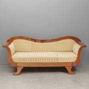 Mahonie driezitsbank op gebogen poten met groen gestreept velours, Biedermeier -fineerschade, bijgekleurde delen zichtbaar-, 88 × 195 × 66 cm