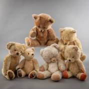 Zes oude mohair teddyberen, jaren '40-'70 -intensief geknuffeld, herstellingen-, grootste beer 67 cm