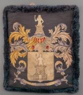 Kussenhoes met geborduurd heraldisch wapen van de familie De Beaufort, r.o. gemonogrammeerd MA d'B, 20e eeuw -achterkant defect, enkele gaatjes-, 52 × 47 cm