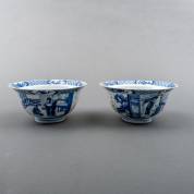 Twee Chinees porseleinen klapmutskommen met blauw-wit decor van figuren op een terras en karakters in vakken, het plat met spelende zotjes, Kangxi gemerkt en periode -chips en haarlijnen-, 7,5 × Ø 15,8 cm