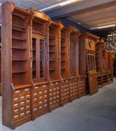 Vierdelige teakhouten apothekerskast met drie ingebouwde tweedeurs kastjes en vele laatjes met geëmailleerde etiketten, daarbij: een deur voor het middengedeelte en een losse toonbank, art nouveau -minstens eenmaal ingekort, enkele etiketten vervangen/missend, defecten aan profieltjes en plinten, defecten aan toonbank, mogelijk van later datum-, 290 × 917 × 48,5 cm, 12160