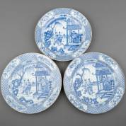 Drie Chinees porseleinen schotels met blauw-witte decors: scène uit de 'Romance of the three kingdoms', Dong Zhuo kijkt naar Lü Bu en Diao Chan vanuit het Fenikspaviljoen, de rand met vier kostbaarhedendecors in cartouches, Yongzheng, niet gemerkt -één met randchip, één met fleabite, enkele bakfoutjes-, Ø 37 cm
