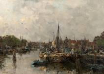 Johan Hendrik van Mastenbroek (1875-1945), gezicht op de Leuvehaven te Rotterdam, olieverf op doek, l.o. gesigneerd en gedateerd 1902, gedoubleerd, 51 × 71 cm -verso resten van papieren tentoonstellingslabel Milwaukee Art Society, en papieren kaartje MacConnal - Mason Art Gallery, London, inclusief kopie aankoopfactuur MacConnal - Mason, 7 mei 1998)