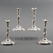 Vier zilveren Louis Quinze kandelaars, met rocaille- en volutendecor in de stam, de gecontourneerde voet met drie geappliceerde pootjes in de vorm van rocailles om een glad medaillon, meester: Hendrik Fortman, Leiden, 1755-1766, met bladvormige bobèches van later datum, gewicht 1807 gram, hoogte 20 cm