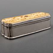 Zilveren tabaksdoos, het deksel ingelegd met gestoken ivoren scène van beweegbaar liefdespaar, omgeven door Chinees decor, ook de bodem ingelegd met ivoor, zilver meester: Jan van Giffen, Groningen, 1774-1775, brutogewicht 186 gram, 14 × 5,3 × 3,6 cm -kopie CITES EU-certificaat bijgevoegd, geen uitvoer buiten de EU-