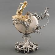 Deels zilveren nautilusbeker, de zilveren voet gesierd met cherubijntjes, schildpadden en edelstenen, het montuur eveneens gezet met edelstenen, nimfen en zeewezens, kikker en putti, de deksel met cellospelend cherubijntje, brutogewicht 2019 gram, 39 × 30 × 18 cm -defecten-