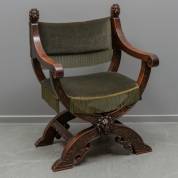 Eiken dagobertstoel met gestoken leeuwenmascaron in de kruisverbinding en leeuwenkoppen op de rugleuning, 17e eeuw, 92 × 65 × 45 cm