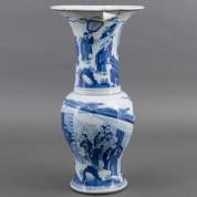 Chinees porseleinen yen yen vaas met blauw-wit decor: hoogwaardigheidsbekleders in tuinkamer, en op de hals figuren in tuin, Kangxi -ernstige defecten aan hals en lip: onvakkundig gelijmde scherven, één scherfje is nog aanwezig, en één scherfje ontbreekt-, 47 × Ø 23,5 cm