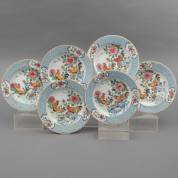 Zes Chinees porseleinen famille rose borden met hanendecor, Yongzheng -één bord met randchipjes en haarlijn in bodem, drie andere borden met kleine randdefecten-, Ø 22 cm