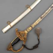 Eresabel in schede uitgereikt aan Jan Hendrik Cornelis Godin (1833-1886), luitenant-kolonel infanterie bij het Oost-Indisch Leger, toegekend in 1880 voor zijn daden gedurende de campagne in Atjeh tussen 23 juli 1878 en 23 maart 1879, de kling met gegraveerde tekst 'Koning Willem III - Voor getoonde dapperheid', met origineel koppel, portepee en mahonie bewaarkist, uitvoering Frans Pauwels, Den Haag, lengte met schede 100 cm