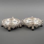 Paar 1e gehalte zilveren bordenkomfoors met palmetdecor, twee scharnierende ringvormige greepjes en losse zilveren binnenbak op vier gezwart houten pootjes, meester: Hendrik Swierink, Amsterdam, 1739, brutogewicht 1542 gram, circa 7,5 × Ø 20 cm
