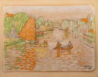 Jan Toorop (1858-1928), kanaal bij Veere met roeiboot en zeilbootje, potlood, r.o. gesigneerd en gedateerd 1913, 11,3 × 15,5 cm, verso opschrift: [...] Tante Monica heeft de schets zelf in haar jonge jaren van Jan Toorop gekregen als dank voor het vinden van zijn rozenkrans, die hij in de duinen bij Domburg had verloren.', een zeer vergelijkbare tekening bevindt zich in collectie van het Rijksmuseum Amsterdam