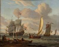 Abraham Jansz. Storck (1644-1708), schepen voor de Hollandse kust, olieverf op doek, l.o. gesigneerd en gedateerd 1683 -craquelé, randbeschadigingen, enkele partijen dun-, 29 × 36 cm