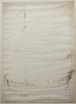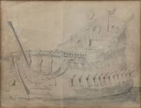 Willem van de Velde de Oude (1611-1693), studie van een Engels fregat, grafiet en inkt op papier, niet gesigneerd -verkleuringen, enkele intekeningen gemaakt door lijstenmaker-, papiermaat 28,3 × 45,5 cm, de lijst met verso annotatie '[...] Hannema - uit de boedel van Wim van Vollehoven verkregen voor fl. 800.-' op het papier zelf verso de annotatie '1955 - volgens Hannema een W van de Velde de Oude'