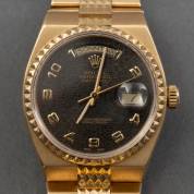 18kt gouden herenpolshorloge, Rolex, Oysterquartz Day-Date 'Pyramid', met zwarte wijzerplaat en goudkleurige Arabische cijfers, aan 18kt gouden geïntegreerde 'Clous de Paris' band, referentienummer: 19028, Rolex doos aanwezig met Rolex garantiebewijs en boekje, daarbij mapje met servicepasje en diverse papieren van juwelier met kleine reparaties of aanpassingen, circa 1986, brutogewicht: 166,8 gram, Ø 36 mm