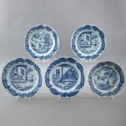 Vijf Chinees porseleinen 'Theeproductie' borden met blauw-wit decor van de Chinese theeproductie, elk met een ander stadium in het proces, de rand met uitgebreid rococo-rolwerk, de achterkant met de cijfers 7, 10, 13 (2×) en 21, Qianlong, circa 1735 -rimfrittings en haarlijnen-, tweemaal Ø 32 cm, driemaal Ø 29 cm