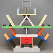 Open boekenkast opgebouwd uit veelkleurig laminaat, model Carlton, ontwerp Ettore Sottsass, uitvoering Memphis Milano, Italië, jaren '80 -originele merkplaatje los maar aanwezig-, 196,5 × 190 × 40 cm, opbrengst komt ten goede aan Museum Boijmans Van Beuningen