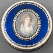 Ronde 18kt gouden snuifdoos, gedecoreerd met het portret van vermoedelijk koningin Wilhelmina van Pruisen (1774-1837), omgeven door 40 oudslijpsel diamantjes, en blauw en wit email, onduidelijk gekeurd, 18e eeuw -enkele kleine defecten aan de witte email biezen-, brutogewicht 81,4 gram, circa 2 × Ø 6 cm, 20480
