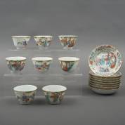 Acht Chinees porseleinen famille rose kommetjes en schoteltjes, decor: ontmoeting tussen een man en een vrouw, Xianfeng gemerkt en periode -drie schotels met sterbarst, drie kommetjes met haarlijn, enkele chips-, schotel Ø 13 cm