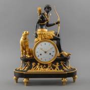 Vuurvergulde en gepatineerde bronzen pendule 'Au bon sauvage' met personificatie van Afrika, in haar handen een pijl-en-boog, naast haar een aangelijnde panter, haar voeten rustend op een schildpad, de wijzerplaat gesigneerd Chopin à Paris (werkzaam tussen 1808 en 1825), het geheel op een ovaal basement met een reliëf van putti en guirlandes, staand op zes toelopende pootjes, Frankrijk, inclusief slinger en twee sleutels, binnenzijde kast met label: Melgert Spaander Uurwerken en Speeldozenrestauratie, Zutphen, genummerd 1067 en 4-1991, staand onder glazen stolp, afmetingen pendule 47 × 36 × 15 cm, hoogte stolp circa 62 cm