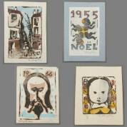 Tsuguharu Foujita (1886-1968), vier kerstkaarten: 1955, 1963, 1964, en 1966, alle houtblokdrukken, r.o. gesigneerd, twee ervan, 1955 en 1963, verso beschreven door de kunstenaar, die van 1964 met losse brief erbij -volgrecht van toepassing-, grootste kaart 14,6 × 10,2 cm, daarbij: portretfoto van de kunstenaar met onderschrift van zijn hand: 'A mes Amis Leni et Stefan De Vriendt, Amicalement Foujita, Paris 21.04-54', en vijf beschreven enveloppen, herkomst: familie Stefan de Vriendt