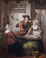 Adriaan de Lelie (1755-1820), keukenstuk met man en twee vrouwen die groente en vis snijden, in het raamkozijn een pijprokende man, marouflé, r.o. gesigneerd -enkele restauraties en inschilderingen-, 64 × 52 cm