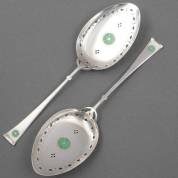 Paar 1e gehalte zilveren gesatineerde dienlepels gedecoreerd met groene email cirkels, meester: J.M. van Kempen & Zonen, 1905, gewicht 117 gram, 21 cm