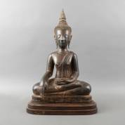 Bronzen Lanna Boeddha, de handen in Bhumisparsha Mudra, Thailand, 16e-eeuwse stijl en mogelijk periode -duim van rechterhand defect-, 62 × 40 × 20 cm