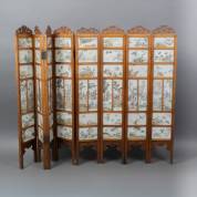 Achtdelig padoek scherm met Chinees porseleinen qianjiang cai plaquettes met decors van figuren, landschappen, bloemen, planten en vogels, 19e/20e eeuw -de houten ornamenten zijn grotendeels los, enkele defecten aan het houtwerk-, circa 110 × 153 cm