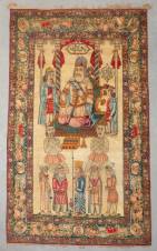 Figuratief Perzisch tapijt Kirman: koning Hushang op troon, omringd door dienaren, twee half dierlijke figuren en vijf mannen met baarden, de rand met portretmedaillons en allerlei dieren in landschap, met signatuur: Ali Kermani, eind 19e/begin 20e eeuw -voorzien van ogen voor wandophanging, diverse kleine vlekjes-, 237 × 141 cm