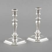 Paar 1e gehalte octagonale zilveren kandelaars met balustervormige stam, meester: Steven des Rousseaux, Amsterdam, 1711, gewicht 753 gram, hoogte 17 cm