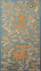 Chinees zijden borduurwerk met tekst 'Verwelkom het jubileum', in houten omlijsting -gaatje-, lijst 103,5 × 63 cm
