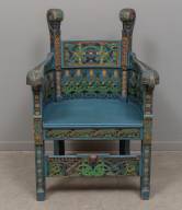 Lars Kinsarvik (1846-1925), polychroom beschilderde houten 'Viking revival' armstoel met gesneden Noorse motieven, niet gesigneerd, circa 1908 -gebruikssporen-, 104 × 67 × 57 cm, met daarin kussen van later datum